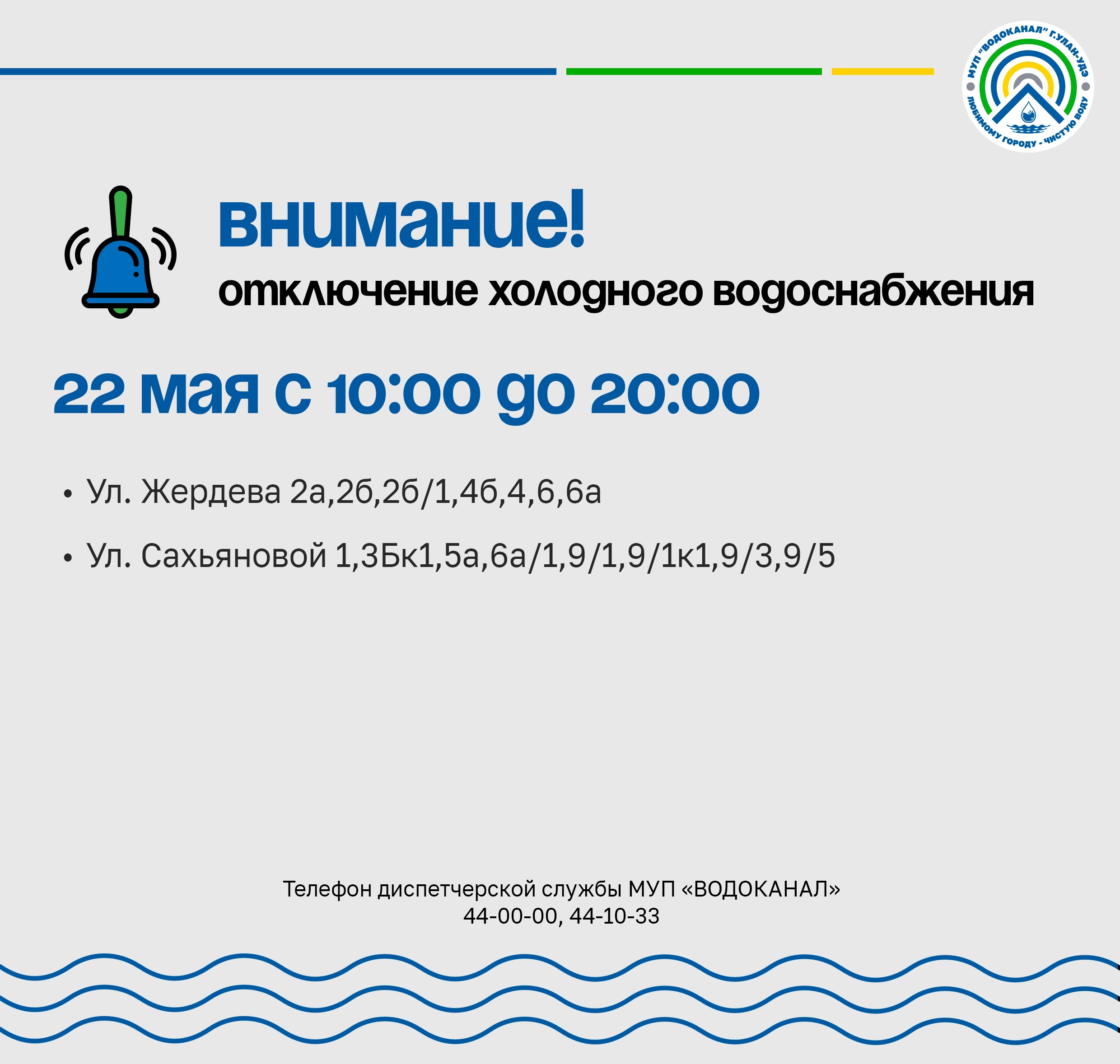 22 мая в Улан-Удэ с 10:00 до 17:00 будет произведено частичное отключение холодного водоснабжения на улицах Жердева и Сахьяновой. Воды не будет в связи с проведением плановых работ по замене запорной арматуры Ду-50мм на водопроводной сети по адресу: ул. Жердева, 6. Список домов в карточке ниже: