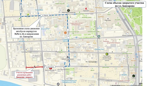Работы продолжатся ориентировочно до середины июля. Из-за этого изменятся схемы движения автобусных маршрутов № 3 и 3А в направлении площади Банзарова.