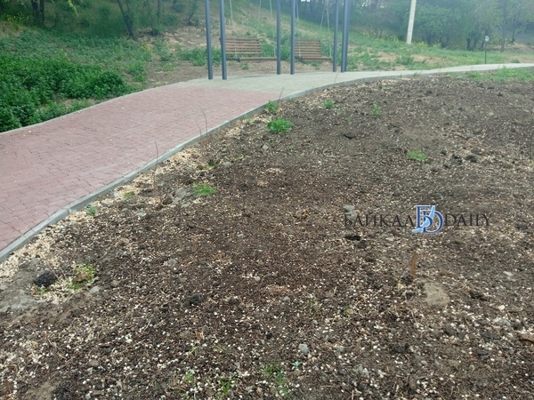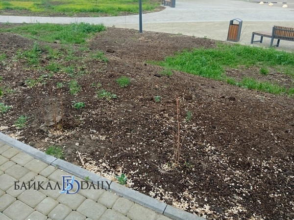«С озеленением южной части парка «Мемориал Победы» в центре Улан-Удэ что-то не ладится. Трава, посеянная этой весной, взошла фрагментарно. В основном, на этом песке (хоть немного грунта и завезли!) растут традиционные полынь да сорняки. Как и до реконструкции. Большинство саженцев кустарника, высаженные прошлой осенью, засохли. Листиков нет! Хоть их и окопали. Иногда поливают. Многие ёлки и сосенки тоже стоят жёлтые. Почему в 21 веке ничего не могут сделать улан-удэнские горе-озеленители?»