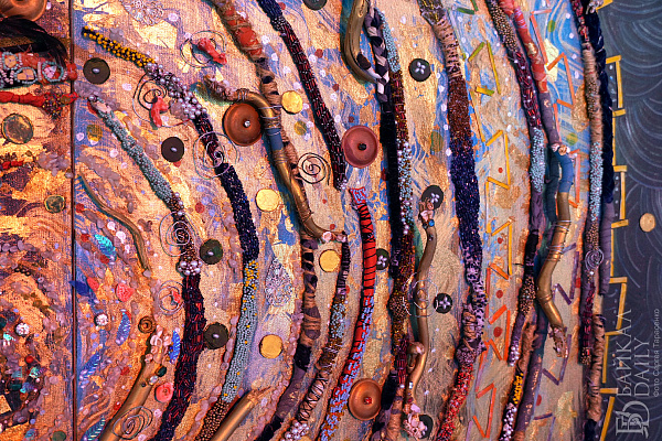Евгения Дугарова работает в разных техниках: живопись, инкрустация, вышивка, лепка. Экспонаты выставки — мандалы, декоративные панно, скульптуры и куклы. Евгения представляет уникальное сочетание перформанса и инсталляции, создавая захватывающее и многогранное произведение искусства.