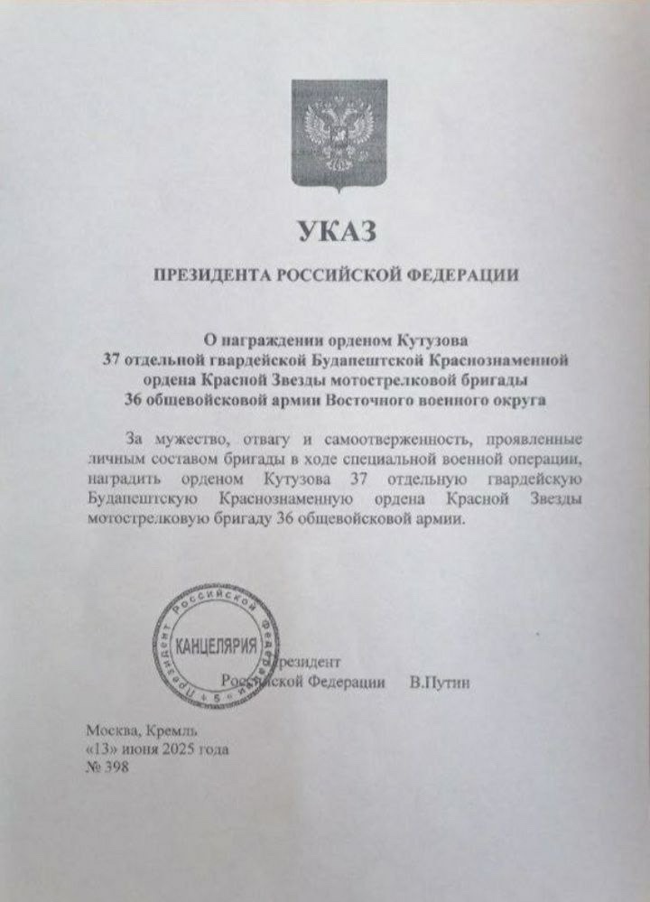 Бойцы 37-й отдельной гвардейской мотострелковой бригады получили высокую государственную награду — орден Кутузова. Об этом на своей странице сообщил глава Бурятии Алексей Цыденов.