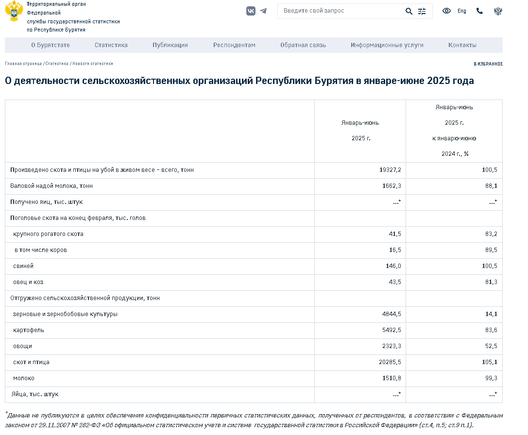 Напротив строки «яйца» на официальном сайте Бурятстата стоит многоточие, а в сноске говорится, что информация «не публикуется в целях обеспечения конфиденциальности первичных статистических данных, полученных от респондентов».