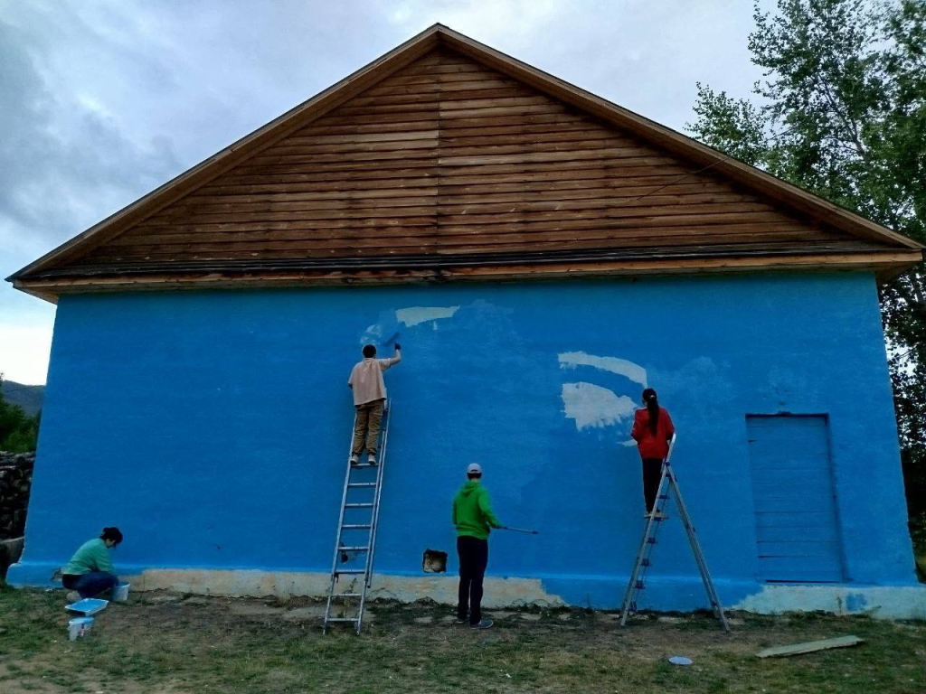 В Баргузинском районе Бурятии в ближайшую неделю преобразится байкальское село Максимиха. Сюда приехала команда художников, чтобы создавать ленд-арт на сельских улицах. Так, одним их объектов стала стена сельского клуба.