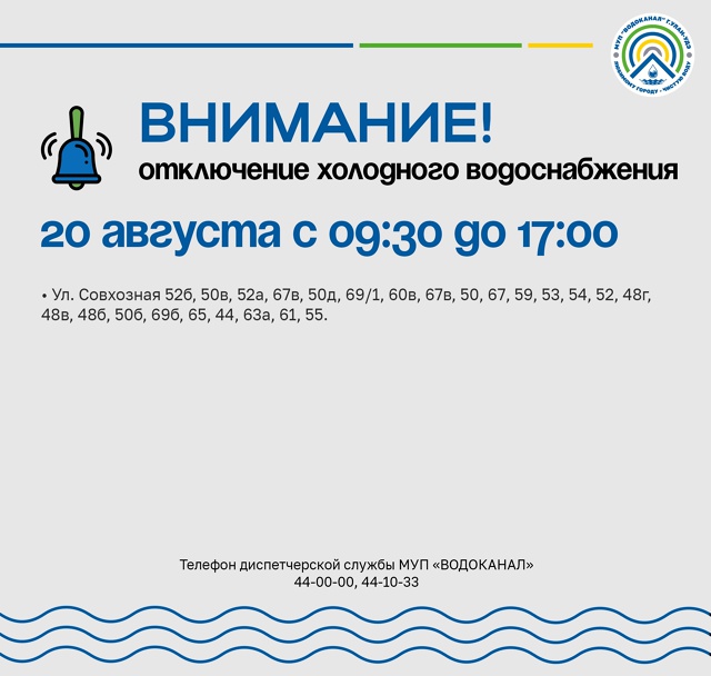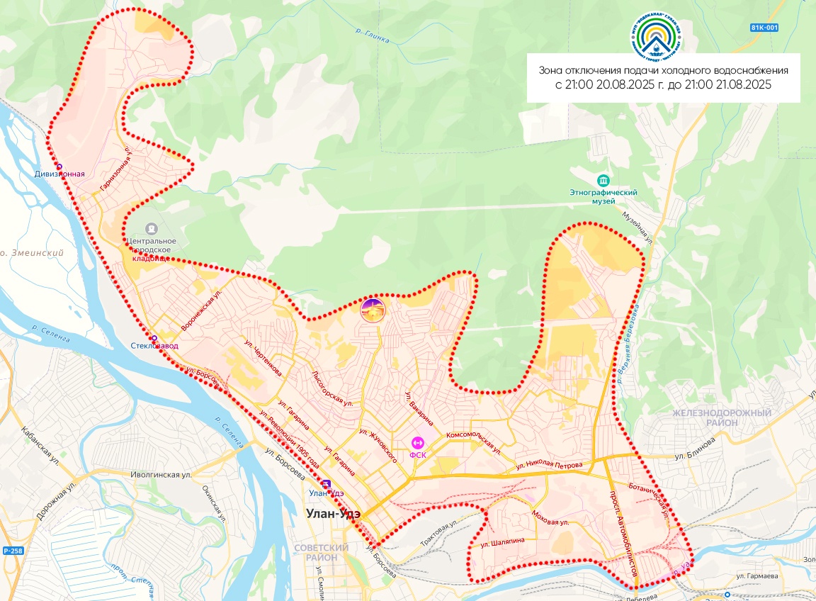 20 августа в Улан-Удэ с 9:30 до 17:00 будет произведено частичное отключение холодного водоснабжения на улице Совхозной. Воды не будет в связи с проведением плановых работ по замене участка трубы холодного водоснабжения ПЭ д-63мм.