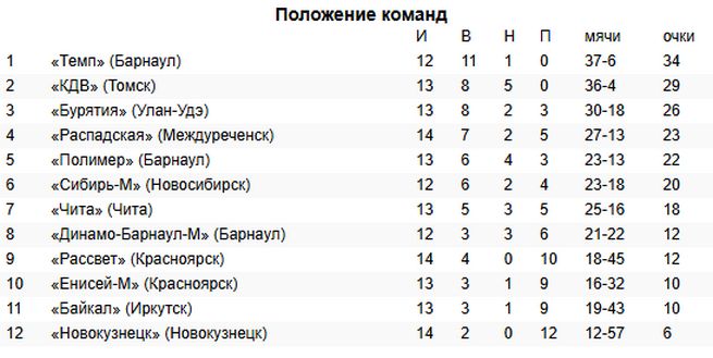 «Темп» является лидером чемпионата. Алтайская команда не проиграла ни одной игры, набрав после 12 игр 34 очка (11 побед, 1 ничья).