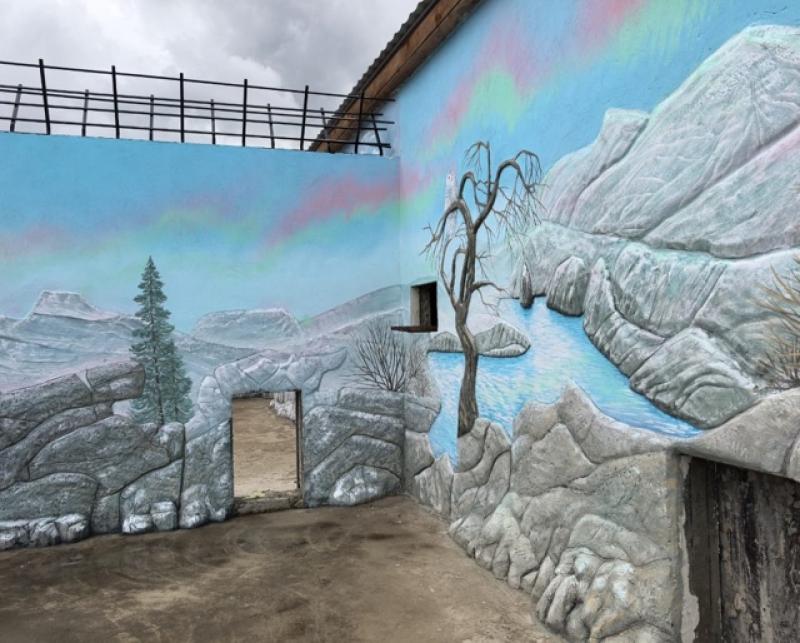 Над картинами трудятся пятеро художников. Они уже закончили с домами медведя и волка. На стенах вольеров уже изобразили скалы и сияющую радугу, а также каменные пещеры и густой хвойный лес.