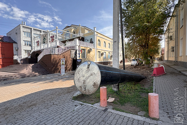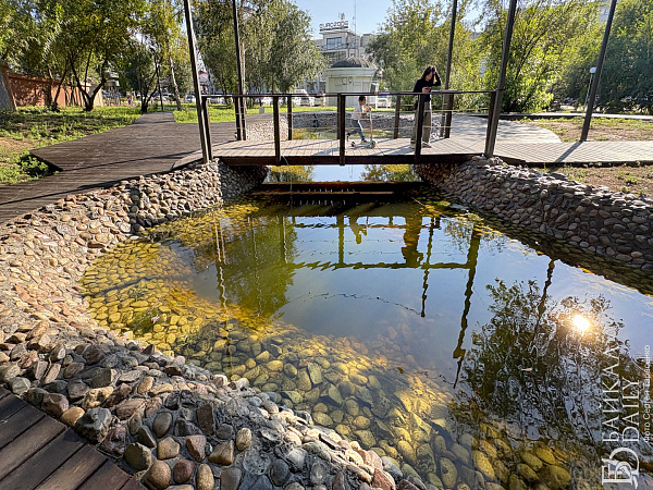 Посетил новый пруд в парке у Мемориала Победы. Вода вроде бы проточная, но зелёная тина присутствует. На другой стороне парка развалилась как гигантский удав большая труба. За забором рабочие в оранжевых касках неспешно что-то постукивают.