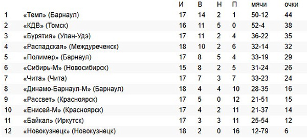 «Бурятия» после поражения 12 сентября в Томске от «КДВ» всё равно занимает третье место, набрав после 17-ти матчей 35 очков (11 побед, 2 ничьих, 4 поражения; 36-22 по мячам).