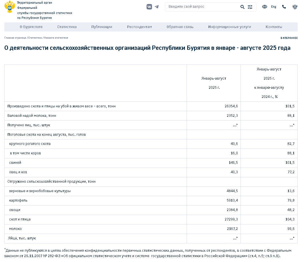 Напротив строки «яйца» на официальном сайте Бурятстата стоит многоточие, а в сноске говорится, что информация «не публикуется в целях обеспечения конфиденциальности первичных статистических данных, полученных от респондентов».