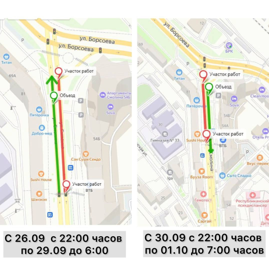 С 26 по 29 сентября по ночам с 22:00 до 6:00 будет перекрыта полоса движения по ул. Смолина на участке от остановки «Виадук» до перекрёстка Смолина – Борсоева.