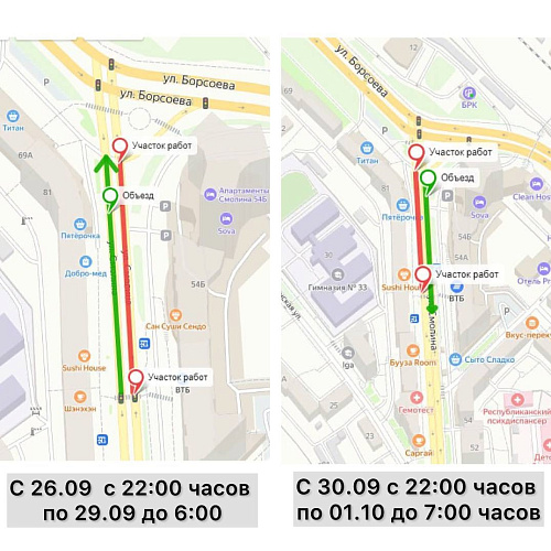 Одну ночь, с 22:00 30 сентября по 7:00 1 октября ремонт будет проводиться в обратном направлении: от перекрёстка Смолина – Борсоева до остановки «Виадук».