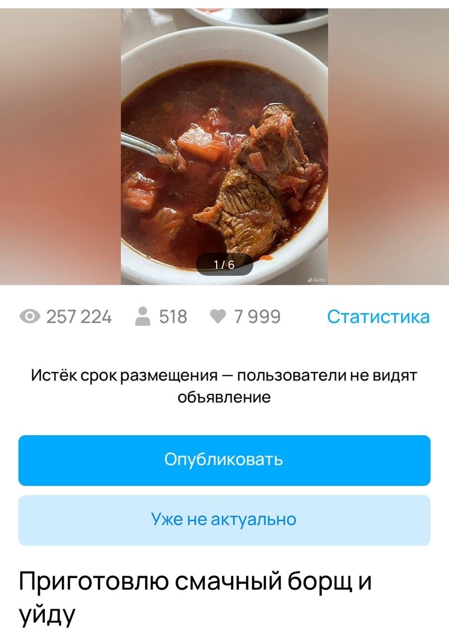 Девушка создала объявление «приготовлю смачный борщ и уйду». Помимо праздных вопросов и банального интереса и удивления были и реальные заказы. Её объявления собрало почти 260 тысяч просмотров стало трендом в социальных сетях и пабликах. Ну и долго не заставило ждать себя приглашение сняться на телевизионных передачах.