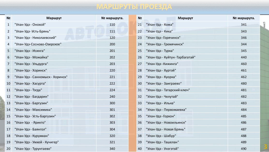С автовокзала на Советской отправлялись 40 межмуниципальных рейсов, один межрегиональный и один международный (Улан-Удэ - Улан-Батор - Улан-Удэ).