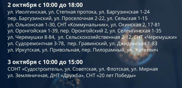 В Улан-Удэ на этой неделе в связи с проведением плановых работ 2 и 3 октября будет частично отключена электроэнергия у некоторых потребителей. Как сообщает администрация Советского района, света не будет по следующим адресам: