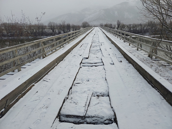 По мосту наблюдается разрушение настила, смещение ряда ледорезов. Поручено произвести расчёт необходимых материалов и работ, расходы будут учтены при распределении дорожного фонда района на 2026 год.