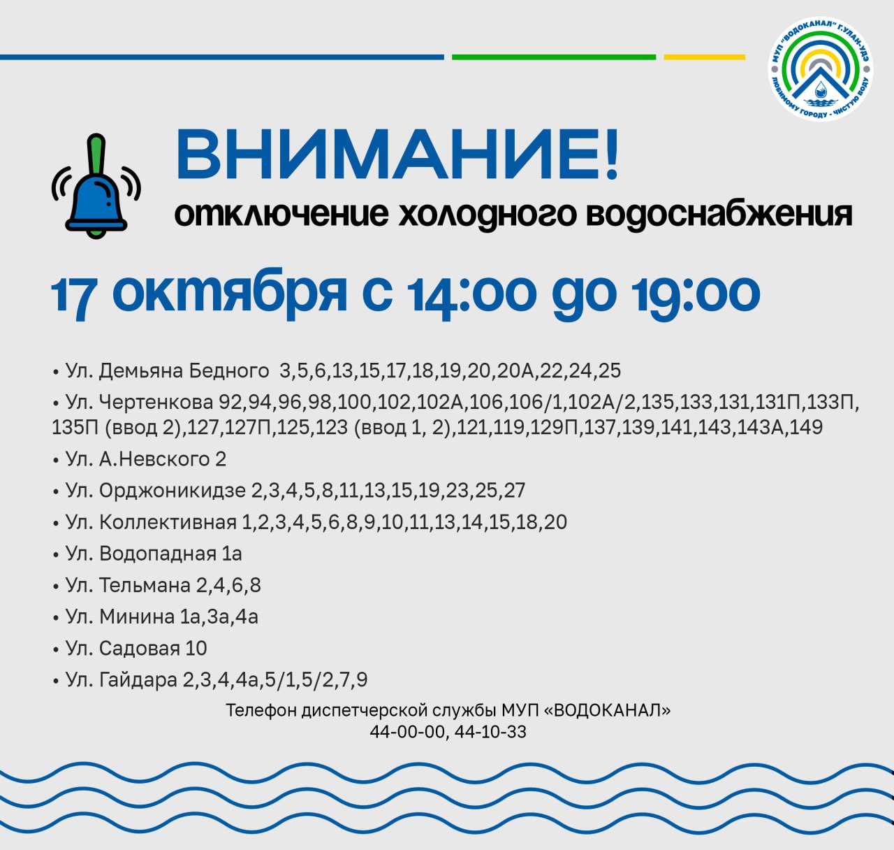 В ближайшую пятницу, 17 октября, в столице Бурятии отключат холодное водоснабжение. Его не будет в нескольких десятках домов на 10 улицах – Демьяна Бедного, Чертенкова, А. Невского, Орджоникидзе, Коллективная, Водопадная, Тельмана, Минина, Садовая и Гайдара.