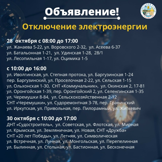 Частичные отключения электричества в городе пройдут 28 и 30 октября. Света не будет по следующему списку адресов: