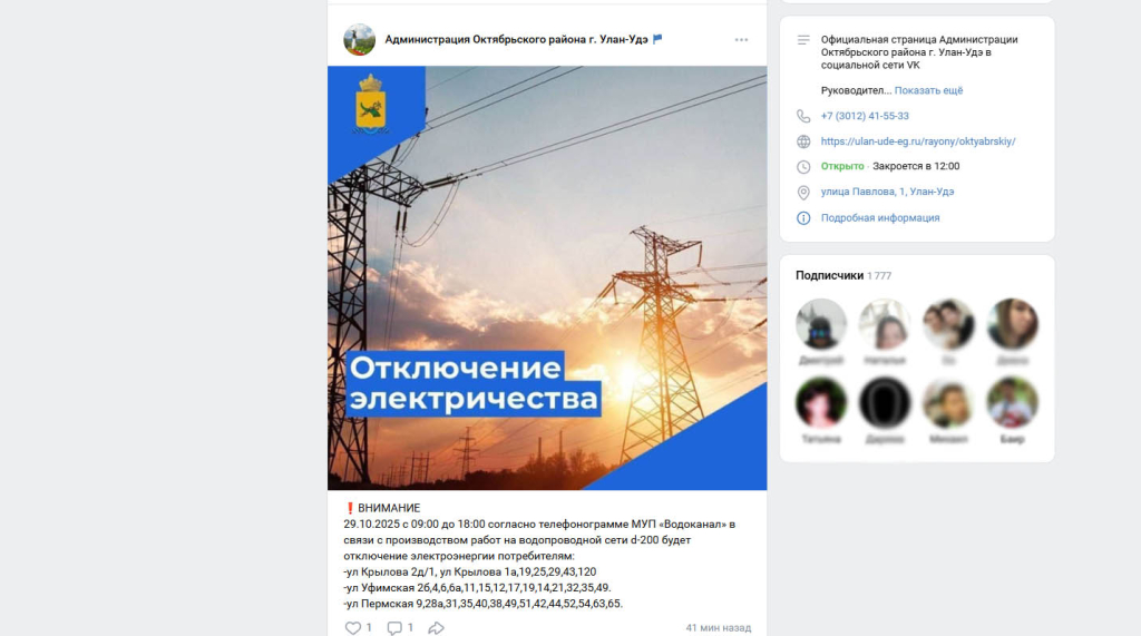 Администрация Октябрьского района города Улан-Удэ сообщила, что 29 октября с 9:00 до 18:00 на трёх улицах состоится частичное отключение электроэнергии потребителям. По её сообщению, согласно телефонограмме МУП «Водоканал» свет отключат в связи с производством работ на водопроводной сети.