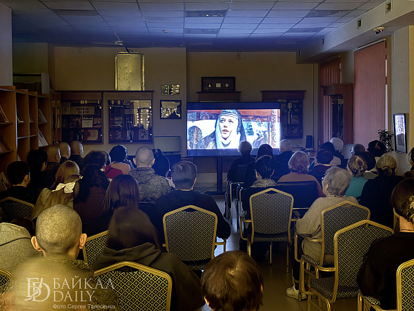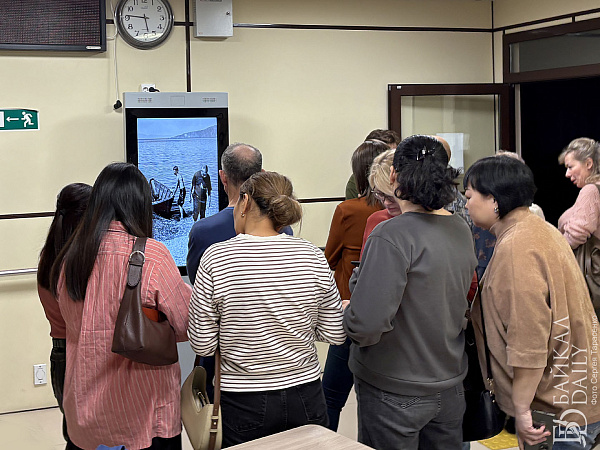 Ретро-настрой добавила и виртуальная фотовыставка чёрно-белых байкальских пейзажей, проходящая здесь же, в холле, на модном вертикальном дисплее. Такой теперь популярный формат. Горизонтальной же и основной части коллекции дождались только самые стойкие ценители, но досмотреть не успели — «ночь» внезапно закончилась. Надеюсь когда-нибудь повторить этот эксперимент.
