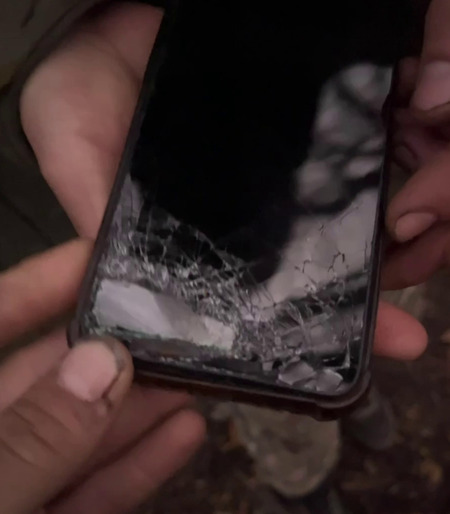 Эту историю рассказал в своём telegram-канале военный корреспондент Чингис Дамбиев. Выпущенная в бойца пуля попала в мобильник, пробив его насквозь.