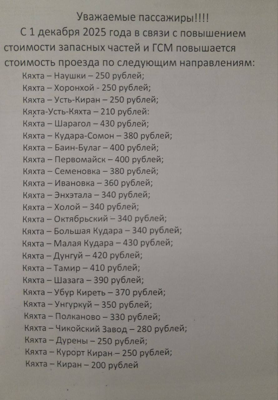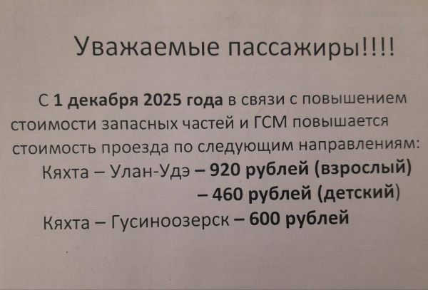 Как сообщили в группе «Кяхта-инфо.24/7», причина - повышение стоимости запасных частей и ГСМ.
