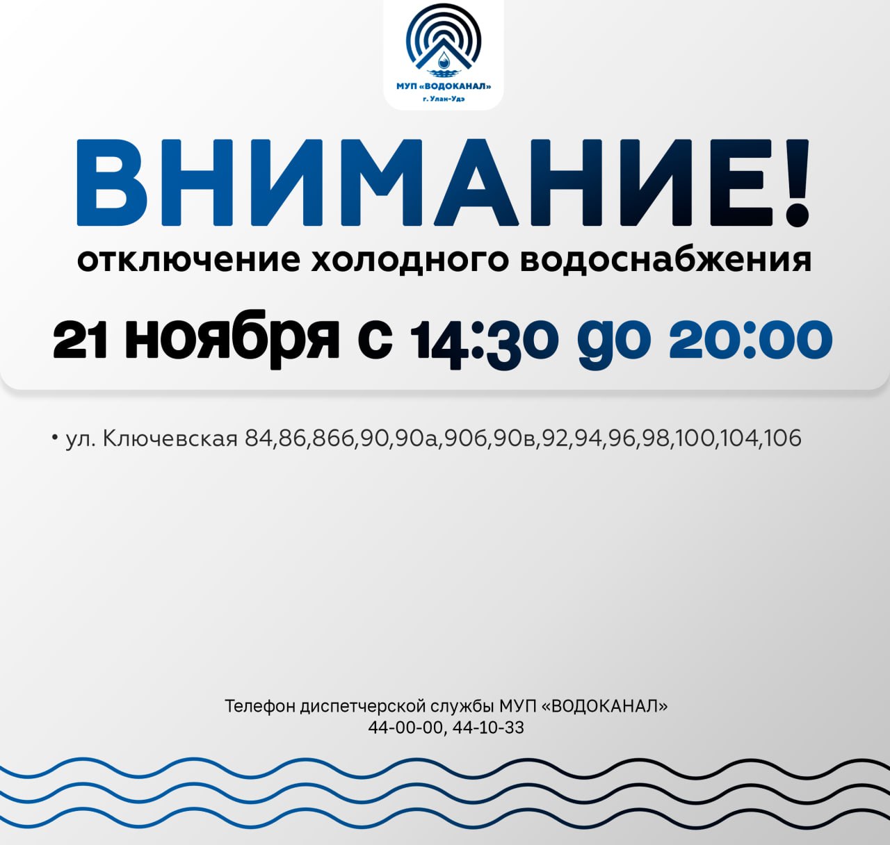 В пятницу, 21 ноября, 14 многоквартирных домов на улице Ключевская в Улан-Удэ останутся без холодной воды. Причина тому – аварийно-восстановительные работы на водопроводной у дома № 92.