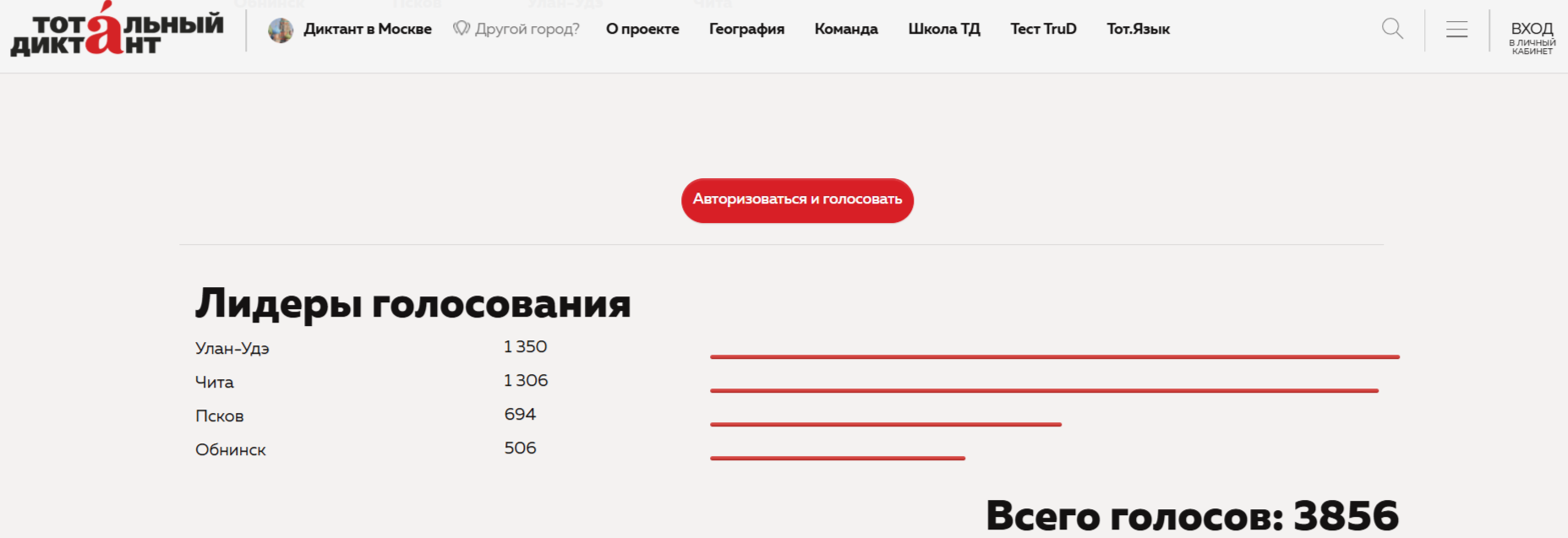 Улан-Удэ борется за звание столицы «Тотального диктанта» (возрастное ограничение – 6+). Народное голосование проводится на официальном сайте акции и сейчас столица Бурятии лидирует в нём, обгоняя соседнюю Читу.