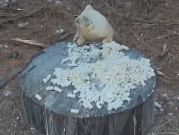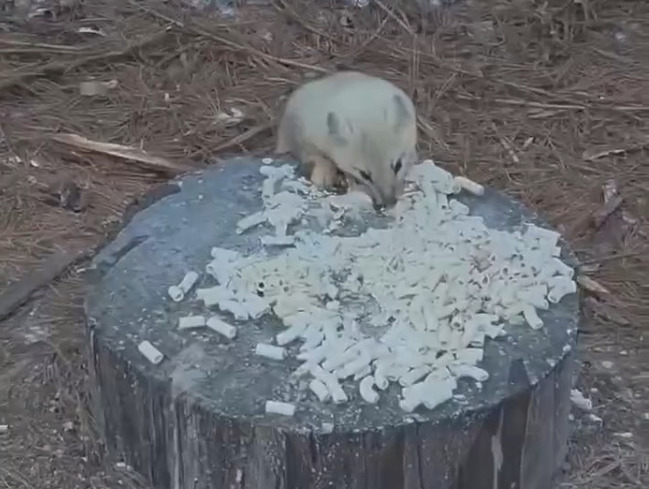 Зверёк, попавший на камеру, как раз уплетал на завтрак варёные макароны, заботливо оставленные сотрудниками базы. Блестящие глазки «блондина» внимательно следили за обстановкой и сам он при этом нетерпеливо поглощал вкусняшки.