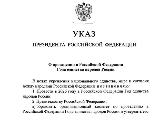 - 2026 год объявлен у нас годом Единства народов России. Вот только что мною подписан соответствующий указ, - сказал глава государства в ходе заседания Государственного совета.