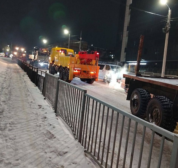 Необычное ДТП произошло накануне в столице Бурятии. На бетонном ограждение на спуске к путепроводу со стороны улицы Революции 1905 года «повис» «КамАЗ».