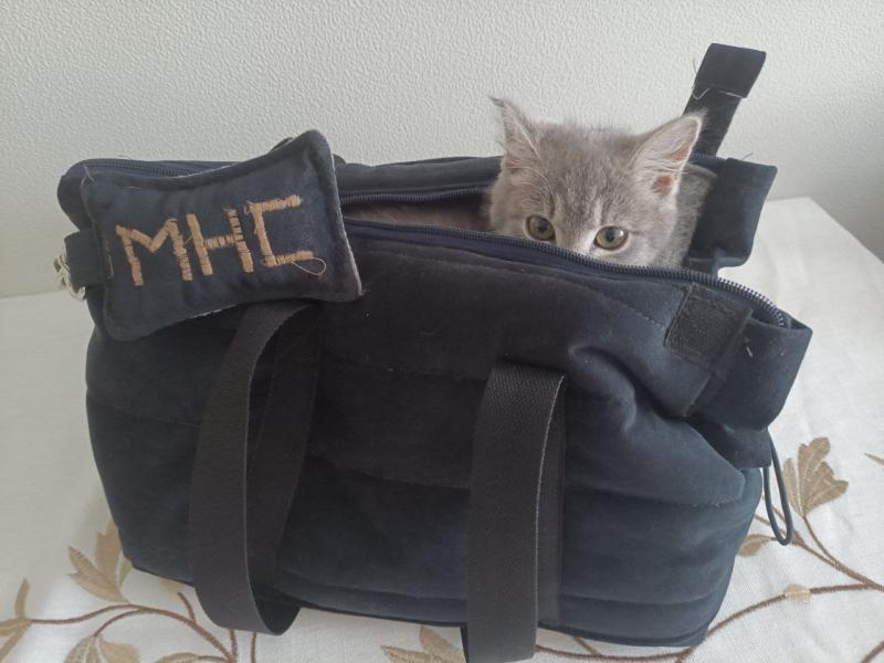 Сотрудница музея «Сухотино» Надежда Петровна сшила для Алиф тёплую переноску с надписью «МНС» (младший научный сотрудник), чтобы котёнок не замерзал по пути на работу.