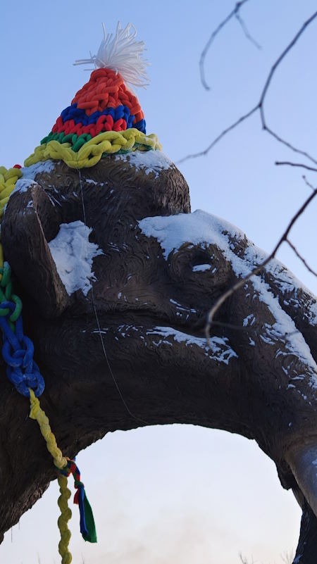 На днях мамонту связали яркую шапочку и надели на его огромную голову.