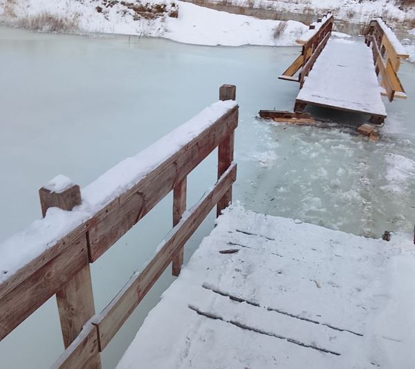 Местных жителей призывают сохранять бдительность и осторожность при переходе через реку в районе разобранного моста.