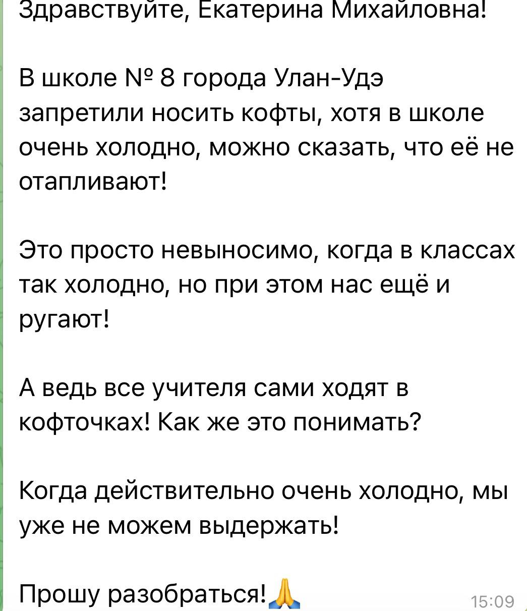 Глава «Лиги безопасного интернета» Екатерина Мизулина опубликовала в своём telegram-канале обращение от учеников школы № 8 в Улан-Удэ. Дети заявили, что им запрещают носить кофты, несмотря на дикий холод.