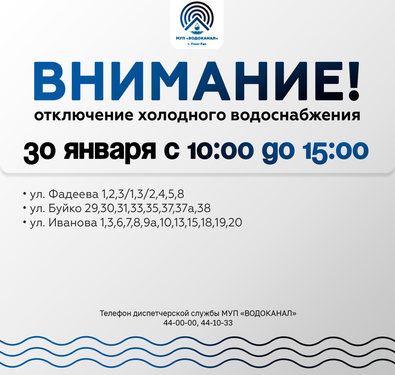 В пятницу, 30 января, на трёх улицах в столице Бурятии – Фадеева, Буйко и Иванова – отключат холодное водоснабжение. Причина тому – замена вентиля на Буйко, 31, сообщили в МУП «Водоканал».
