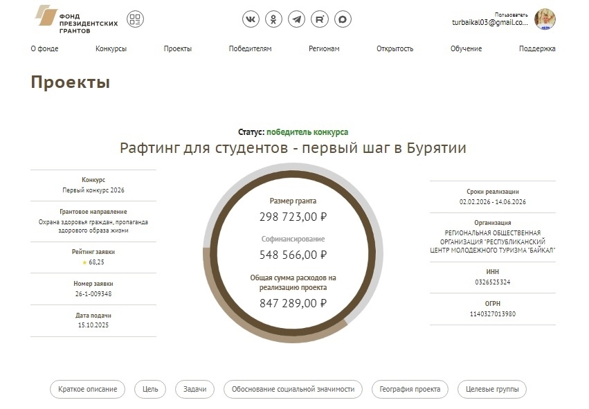В Бурятии команда центра молодёжного туризма «Байкал» победила в первом конкурсе 2026 года фонда президентских грантов. Благодаря этой поддержке будет реализован проект «Рафтинг для студентов – первый шаг в Бурятии».