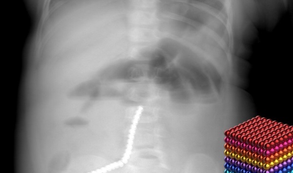 Врачам удалось удалить 9 магнитов эндоскопически (ФГДС). Однако остальные мигрировали по кишечнику, вызвав его перфорацию.
