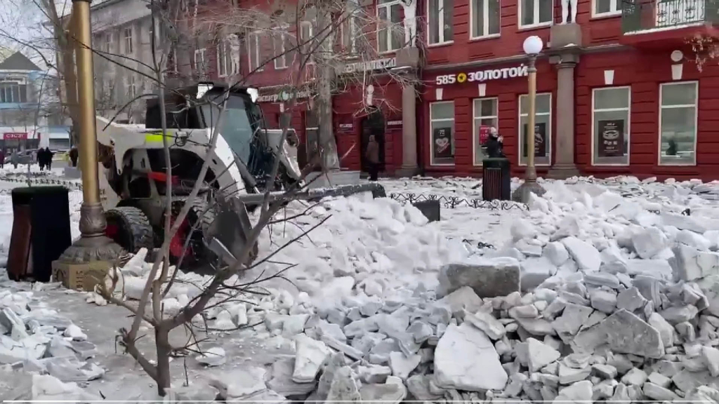 Уже сегодня утром специалисты приступили к очистке от снега пешеходной части улицы Ленина («Арбата»). Работа ведётся поэтапно: специальные машины-погрузчики вскрывают верхний слой замёрзшего снега и собирают для дальнейшей погрузки самосвалами. А там, куда не доходит техника, трудятся дворники.