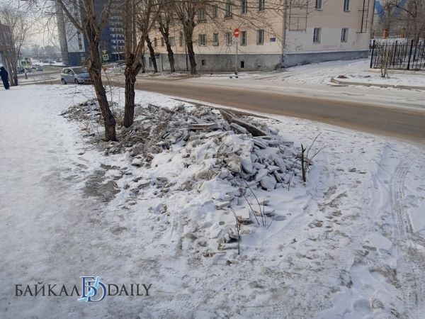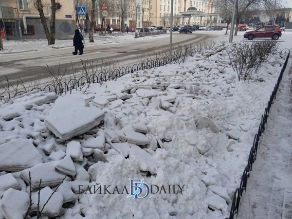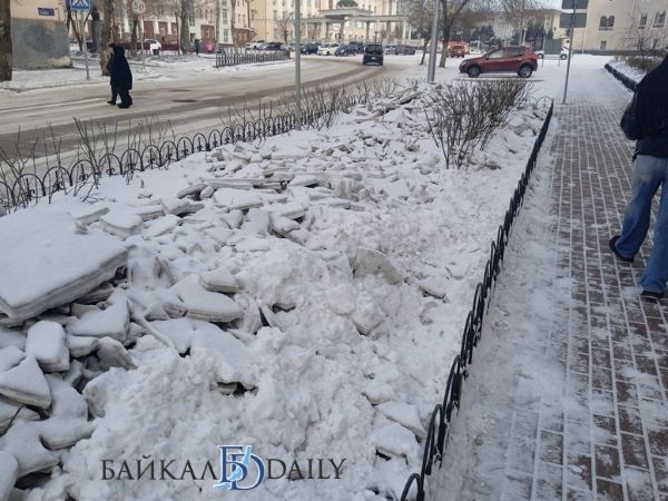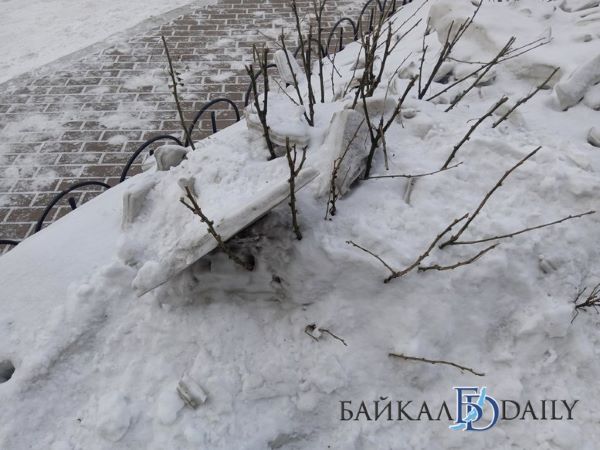 В паблике «Аноним 03» во «ВКонтакте» выложили фотографии снега, который убрали в начале улицы Ербанова в центре Улан-Удэ. Плотные пласты свалили на остатки кустарника, который высаживали при реконструкции старого и строительстве нового здания Национальной библиотеки Бурятии.