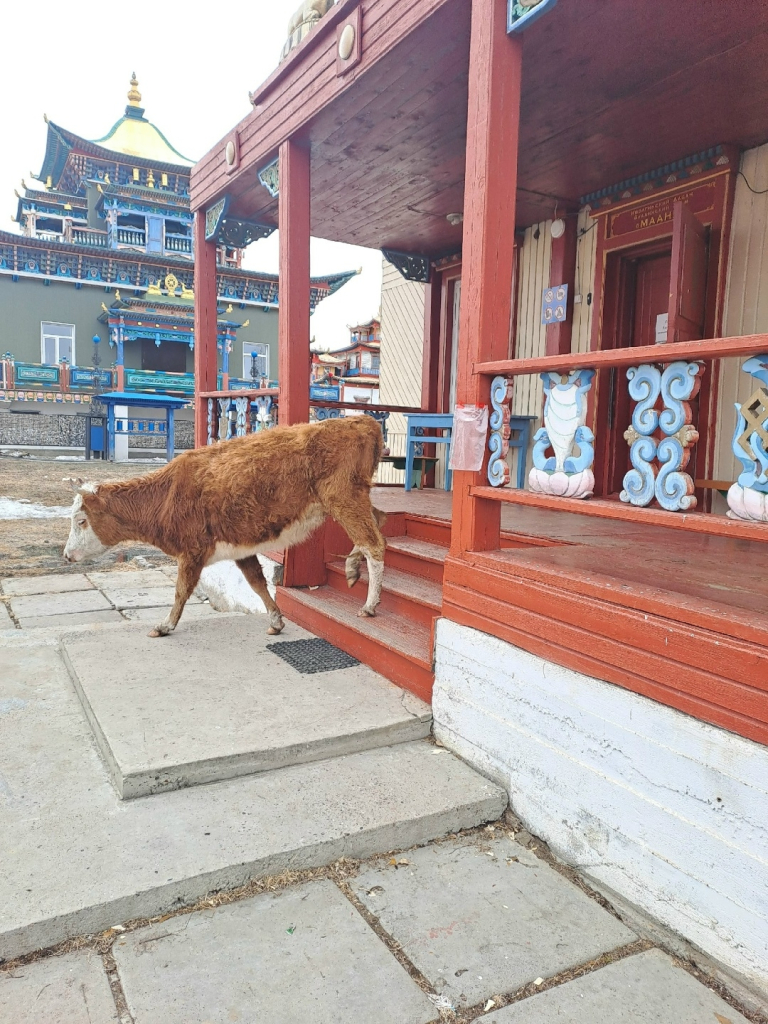 В Иволгинском дацане Бурятии заметили необычного посетителя. По лестнице одного из дуганов спускалась корова. Её заметил и успел сфотографировать автор поста в местном паблике «Аноним 03».