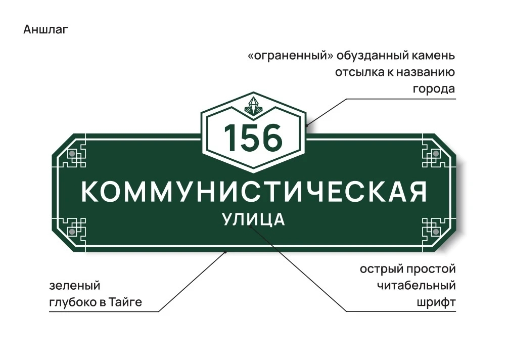 Победителем стала архитектор, член Союза архитекторов России Анна Лекомцева. Её концепция: «Номер дома не просто цифра, а визуальный символ Закаменска. Город как драгоценный камень (нефрит, яшма, агат). Природа создала — человек огранил, придал форму и заставил сиять».