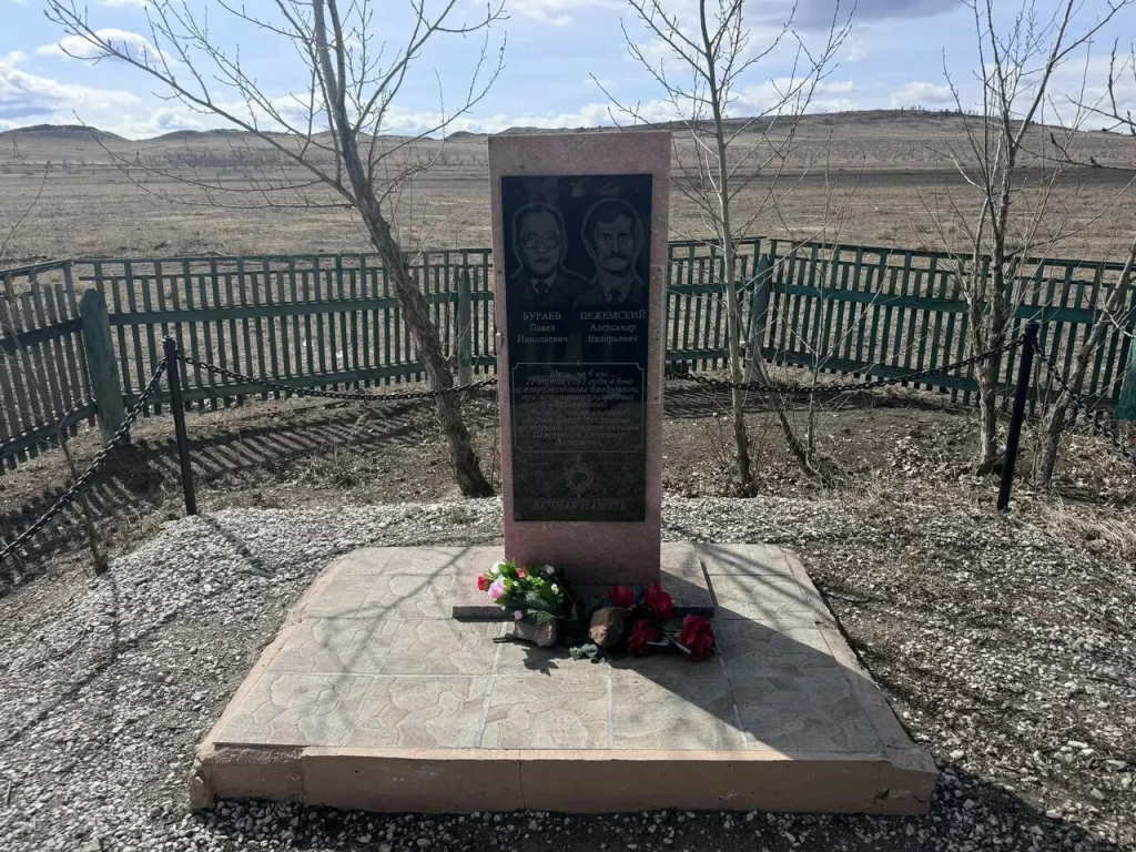 Мемориал посвящён памяти Павла Бураева и Александра Пежемского. Сотрудники погибли 21 апреля 1995 года. В тот день они преследовали вооружённых дезертиров. Автомобиль следственно-оперативной группы обстреляли. Милиционеры Баяр Жалсараев, Александр Пежемский, Пётр Сахьянов и Павел Бураев приняли бой. Преступников обезвредили, но Бураев и Пежемский получили смертельные ранения.