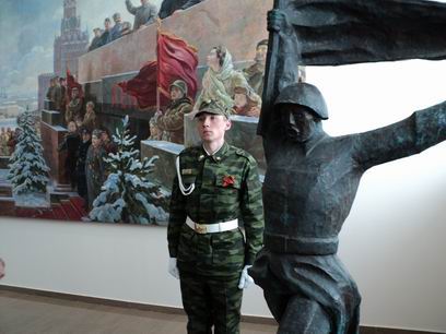 На одной из двух открывшихся сегодня выставок под названием «И помнит мир спасенный» представлены произведения живописи, графики и скульптуры советских и бурятских художников. Один из центральных экспонатов выставки «И помнит мир спасенный» - большое живописное полотно Ираклия Тоидзе «Выступление Сталина на Красной площади».