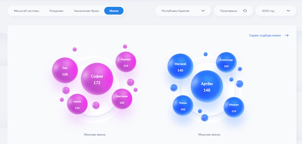 МФЦ приводил свою статистику, представив самые популярные имена детей, рождение которых зарегистрировали в учреждении. Среди мальчиков - это Артём, Михаил и Александр, а из редких – Клим, Тигран и Роберт. Девочек чаще всего называли Виктория, София и Арина. Самыми необычными женскими именами были Алисия, Маро и Рада.