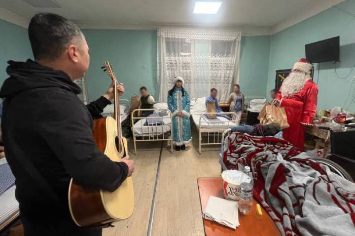 Дед Мороз и Снегурочка поздравили военных с Новым годом, а майор Цыренов исполнил для раненых песни «Родина», «Вечерняя» и другие композиции.