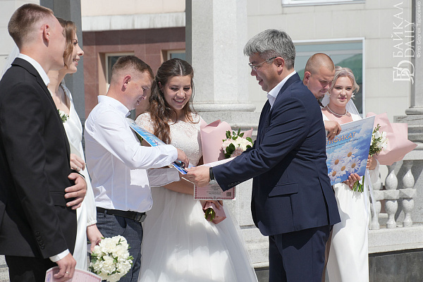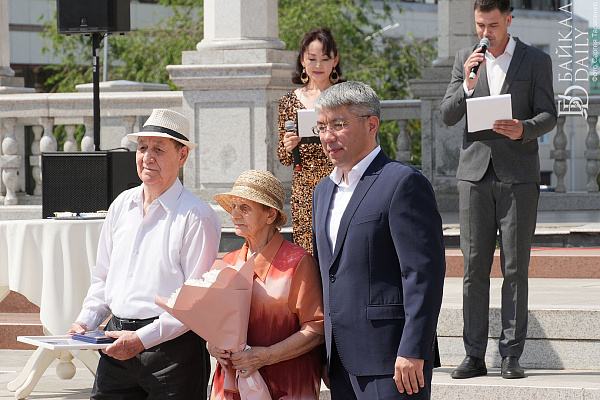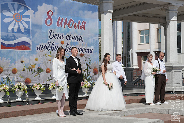 Сегодня на Театральной площади в Улан-Удэ отметили День семьи, любви и верности. Торжественное мероприятие открылось церемонией бракосочетания трёх пар молодожёнов. Их поздравил глава Бурятии Алексей Цыденов.