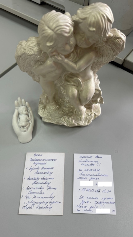 В мае 2024-го ребятишек выписали после повторной госпитализации и операций по удалению металлоконструкций. Мама юных пациентов сделала сотрудникам ДРКБ необычный подарок – она вручила врачам статуэтки в виде двух ангелов и младенца в ладони и открытки со словами благодарности.