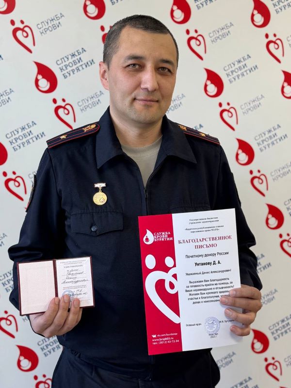14 жителей Бурятии получили звание почётного донора России. Среди награждённых – сотрудник управления ГИБДД майор полиции Денис Унтанов.