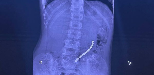 Ребёнок поступил с болями в животе. Инородные тела вызвали повреждение желудочно-кишечного тракта. Несколько магнитов соединились между собой в различных сегментах внутренних органов.
