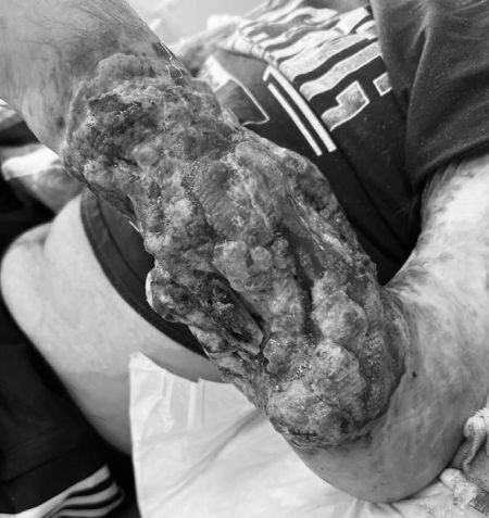 Молодой человек поступил в приёмное отделение онкодиспансера в сопровождении брата. Сам пациент инвалид детства (у него олигофрения). С его слов, опухоль у него уже около года. Но к врачу родные его не водили.